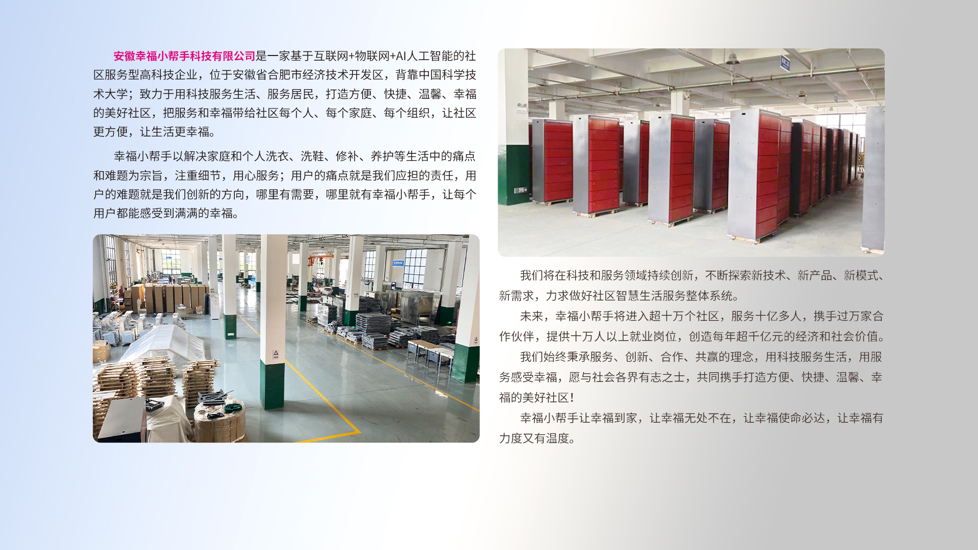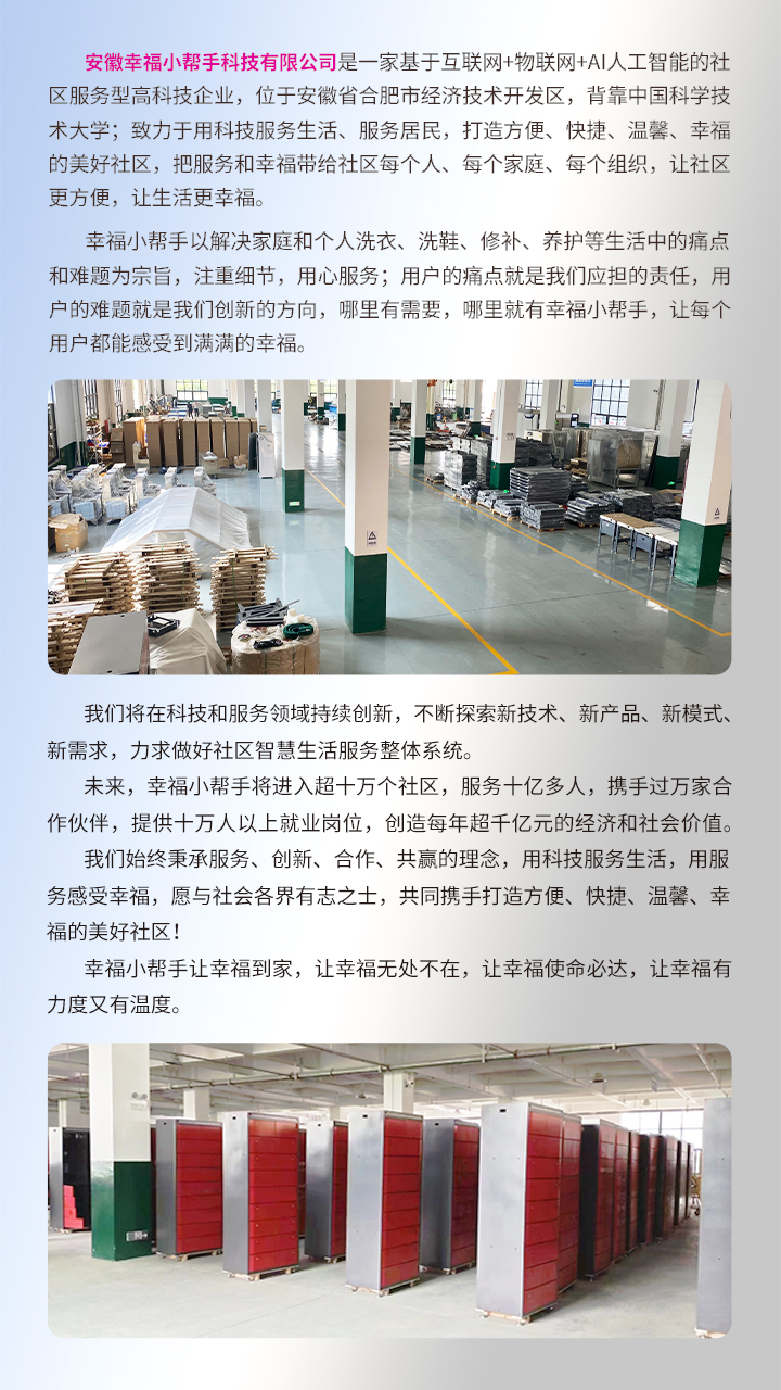 幸福小帮手社区智能共享洗鞋收发柜突破了线上洗鞋的诸多不可逾越的障碍。线下经营成本居高不下,越来越高的店面租赁费,...